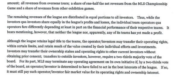 2) Who are the majority owners of MLS LLC? I believe it to be The Anschutz Corp, The Kraft Group, and Hunt Sports LLC and maybe a few others: we know the teams are essentially franchises and MLS contracts with all players, parties, and has authority to make all major decisions. The exact structure is discussed fairly well in the first half of the decision from Fraser vs MLS (see end). Though from 2002, I can find no evidence the fake-competition model has changed nor the original majority owners.