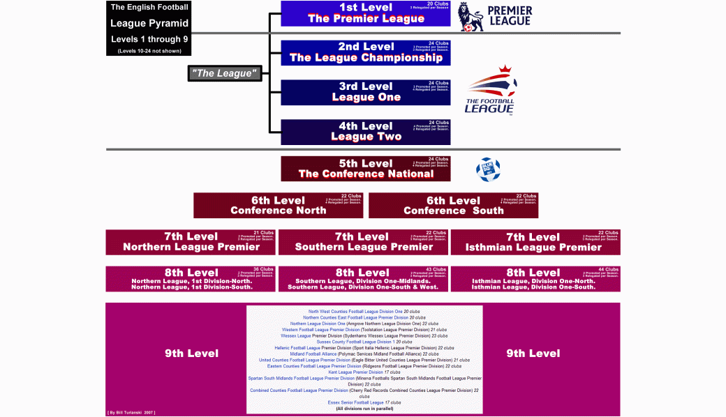 Correspondingly, the three teams that finish at the top of the next lower league are promoted to the top league. This process is repeated throughout a multi-league structure with the total number of leagues depending upon how many eligible teams there are within the overall system. In England for example, there are currently five leagues considered professional national leagues atop a vast network of lower regional leagues.